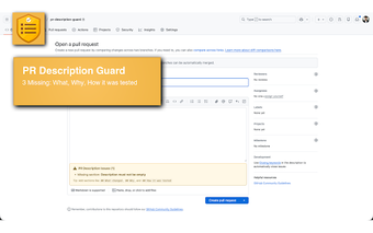PR Description Guard เป็นส่วนขยายของ Chrome ที่ออกแบบมาเพื่อปรับปรุงคุณภาพของคำอธิบายการดึงคำขอ (PR) โดยการทำให้แน่ใจว่ามีข้อมูลที่จำเป็น มันตรวจสอบคำอธิบาย PR แบบเรียลไทม์ โดยกระตุ้นให้ผู้ใช้รวมส่วนที่สำคัญ เช่น 'What changed', 'Why', และ 'How it was tested' ส่วนขยายนี้ให้คำเตือนที่ไม่รบกวนซึ่งช่วยแนะนำผู้ใช้โดยไม่ขัดขวางกระบวนการสร้าง PR ทำให้เป็นเครื่องมือที่มีประสิทธิภาพสำหรับนักพัฒนาที่ต้องการความชัดเจนและความสอดคล้องในงานที่ส่ง